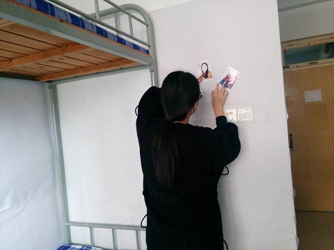 活动开始,同学们首先彻底清扫宿舍,将边缘角落清理干净,这既维持了宿舍整洁干净,营造了良好的生活环境,也体现了居住者的自律精神。随后,各宿舍根据本宿舍特自取宿舍名,并展开讨论,目的是将宿舍名用以自勉,催人奋进,同时创造融洽温馨的宿舍氛围。最后,各宿舍确定自己宿舍的风格,如文雅、温馨、活泼等,并根据各自的风格进行宿舍装扮,通过装饰门面、墙壁、天花板或悬挂健康向上的书画作品或照片或摆放富有特色的饰物,原本简单的宿舍被同学们装扮得温馨而舒适。