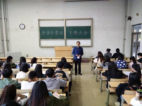 为提高同学们的纪律意识,规范同学们的行为。4月27日,外语系于1号教学楼107教室召开员工干部大会。外语系员工会全体成员及2014级、2015级、2016级全体班级干部参加此次会议,员工科科长卞尊营、辅导员刘浩天主持会议。