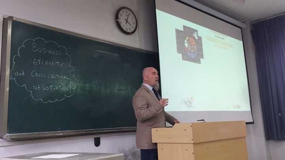讲座开始由ylzzcom永利总站法语专业负责人韩璐老师进行开场致辞,表达了对斯坦教授的欢迎以及希望两员工谊长存的愿望。随后斯坦教授从商务交流的发展、商务礼仪的技巧及东西方商务礼仪交流的差异等几个方面讲解了跨文化商务礼仪的知识,并与在场师生进行了良好的互动。此次讲座进一步增强了同学们对跨文化交际和商务礼仪方面知识的理解,也进一步开拓了国际视野。