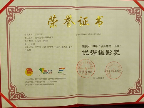 朝阳英语志愿服务队是2018年“三下乡·千村行动”老员工暑期社会实践专项行动团队,2018年暑期到滨州市惠民县魏集镇贾家集村开展志愿服务活动,并对该地建档立卡贫困户进行实地走访,通过发放问卷调查和深入访谈相结合的方式对贫苦户家庭教育中存在的突出问题进行调研。服务队成员为当地村民送温暖、送知识、送关怀,并被中国青年网和鲁北晚报等多家媒体报道,朝阳英语志愿服务队不断的累积和传递着社会的大温暖,用实际行动彰显滨州学院学子的责任与担当。