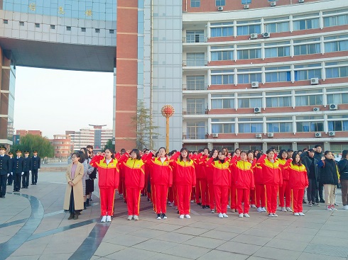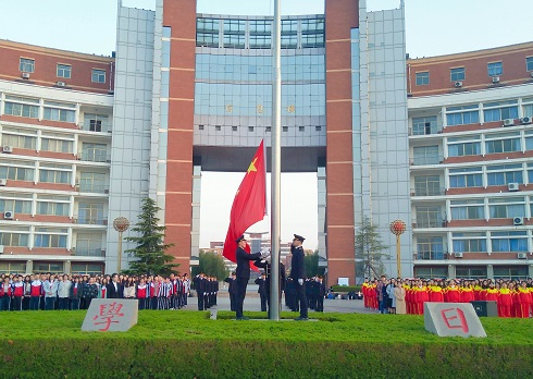 在全体师生的注目下,国旗护卫队队员们护送鲜艳的五星红旗进场,在场全体师生行注目礼,表达了对伟大祖国的无限热爱与崇高敬意。