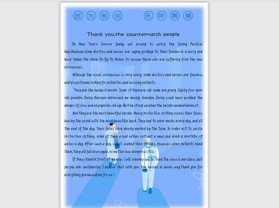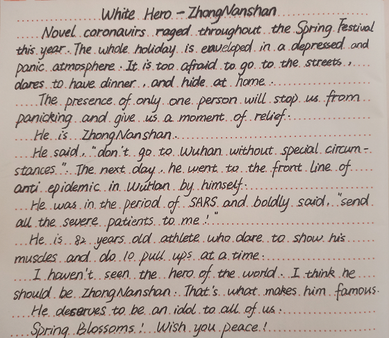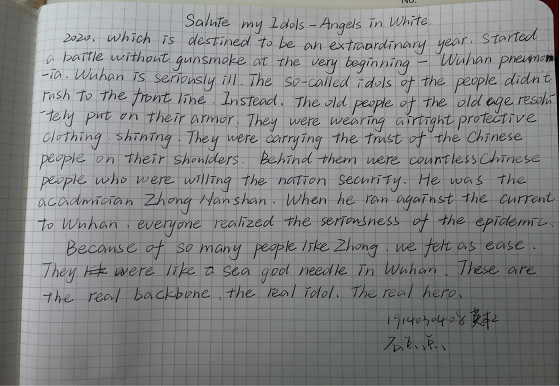 在这抗击疫情胜利之际,为了鼓励同学们在家中积极向抗疫英雄们学习并且提高英语写作水平,推进校园文化建设,ylzzcom永利总站于4月13日举办“春暖花开,偶像归来”英语短文征集大赛。ylzzcom永利总站2018级、2019级部分同学参加了此次活动。