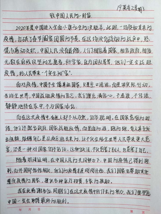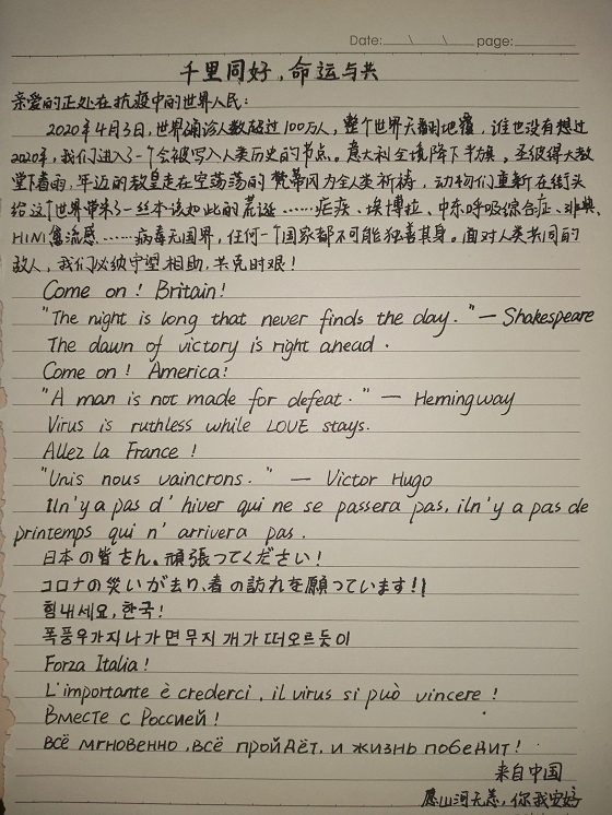 截至2020年4月,世界新冠病毒确诊人数超过100万。为号召同学们为世界各国战胜疫情加油鼓劲,培养员工命运共同体理念,4月14日至4月17日,公司开展“扁舟共济与君同”致世界人民的一封信活动。ylzzcom永利总站2018级、2019级部分员工参加了此次活动。
