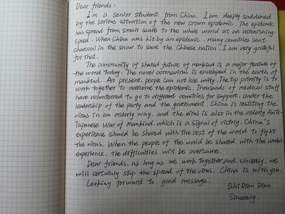活动要求参与员工在保证作品原创性的前提下,以手写书信体的形式,紧扣“扁舟共济与君同”的活动主题,采用多种语言向世界传递诚挚问候。活动中,公司学子表现出高涨的热情,每一封书信都表达了同学们对世界抗疫人民的真挚情感,字里行间感受到员工的积极正能量。活动最后,员工会成员根据书信内容和字迹规范评选出优秀作品并予以奖励。