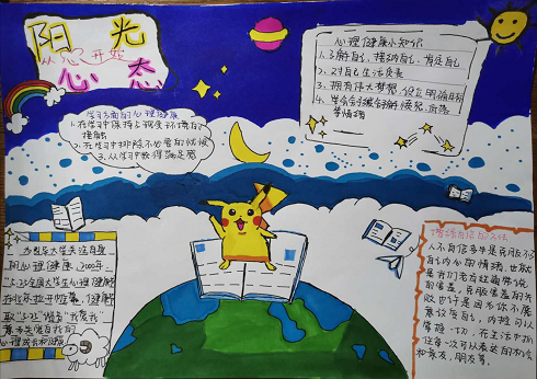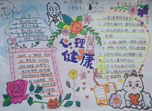 同学们以各种类型的心理健康相关知识为主要呈现内容,以彩绘图画为载体并加以点缀,将其进行排版,所呈现的作品其内容丰富新颖、板块合理清晰、色彩丰富美观,展现出各作品的可读性、实用性、创意性。心理健康标准、心理健康名言、心理健康制约因素、心理健康小诗、如何摆脱忧郁情绪、增强信心的有效方法,其涉及内容类型广且丰富,同学们纷纷表示在此次的手抄报制作活动中既放松心情又增加了其知识的储备。
