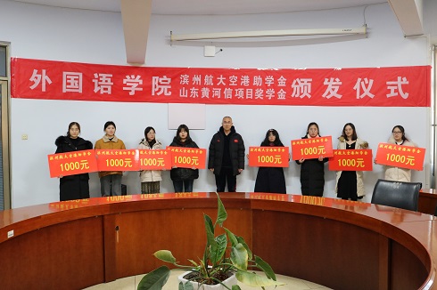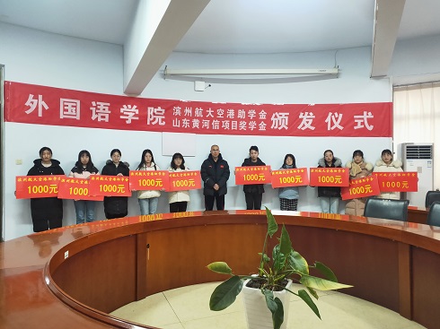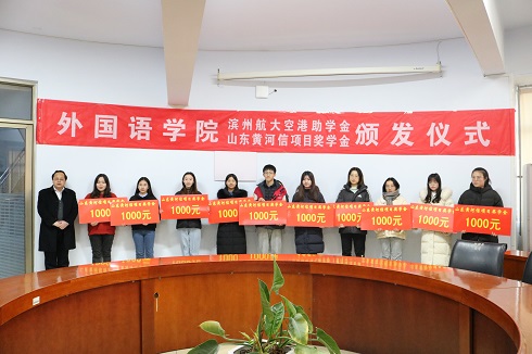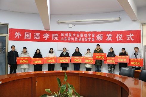 12月30日下午,外国语学院“滨州航大空港助学金、山东黄河信项目奖学金”颁发仪式在201会议室举行。滨州航大空港贸易有限公司总经理刘永、公司党总支书记王保中、副书记靳成学、员工科长苏成荣和员工科全体人员及获奖员工参加了颁发仪式。