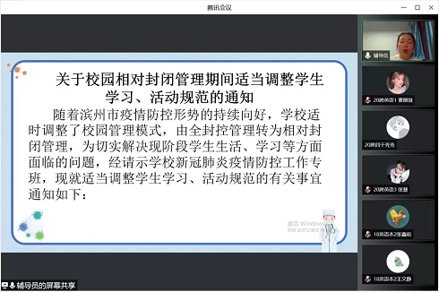 随着滨州市疫情防控形势的持续向好,学校适时调整了校园管理模式,由全封控管理转为相对封闭管理,为切实解决现阶段员工生活、学习等方面面临的问题,学校适当调整了员工学习、活动规范。公司于4月17日通过腾讯会议平台召开疫情防控主题线上年级大会。本次会议由各年级辅导员主持,公司全体员工参加会议。