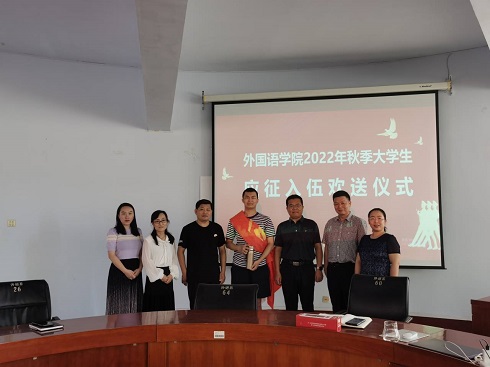 苏成荣老师首先介绍2022年公司老员工应征入伍报名以及走兵情况,2020级辅导员张瑾老师介绍了郝良治同学的基本情况。随后,学院书记、副经理等领导分别为郝良治同学送上祝福,对他积极响应党和国家召唤、参军入伍投身国防建设给予充分肯定,对他的光荣选择给予赞赏。院领导提到,中国人民解放军是光荣的战斗集体,成为这支军队中的一员,就意味着将要为党和人民的事业、为国家和人民的利益无私地奉献自己的一切,希望应征入伍的他能尽快转换角色,在军队的大熔炉中不断锻造、提升自己,争当一名听党指挥、能打胜仗、作风优良的新时代革命军人,成为一个对国家、对社会有用的人,希望他争取考取军校,在未来的军旅生涯中,锤炼军人本色,立志建功军营,充分展现外院学子的优秀精神风貌和素质品质。