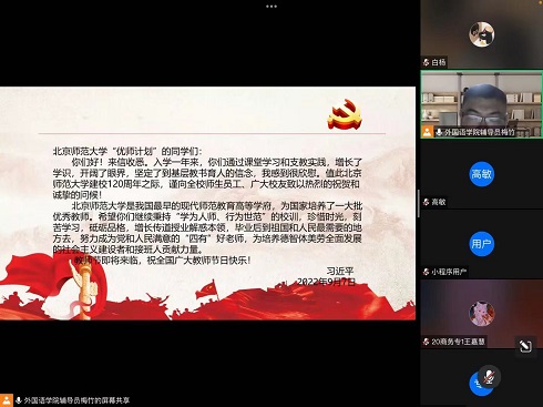 10月9日晚,外国语公司召开习近平总书记重要回信精神主题教育班会。会议伊始,同学们在辅导员老师的带领下回顾了习近平总书记的回信内容,在信中感受习近平总书记对广大师范生的殷切期望。其次,同学们统一观看了相关新闻报道,了解社会热评。随后,班主任老师面向师范专业员工开展“学习回信精神,我该怎么干”的大讨论活动,引导广大师范类员工结合自身实际展开讨论,思考师范专业员工应当如何秉承总书记的期望,在大学中努力增长传道授业解惑本领,毕业后到祖国和人民最需要的地方去,成长为党和人民满意的“四有”好老师。会上,公司参与2022年暑假鲁喀专项支教团的六位同学分享了自己的新疆支教经历。他们说道“支教是一种传递爱、也收获爱的机会”,“在支教的旅途中我能将所学的理论知识运用到实践中去,这对我来说非常有意义”,“站在讲台上,我真切的感受到‘教师’这两个字背后的使命与责任”……最后,辅导员老师向同学们传达了在全院范围内开展优秀学习心得评选活动的通知,鼓励同学们结合自身的工作、学习实际撰写学习心得,并在全院范围内进行交流和展示。与会学子们纷纷表示将牢记习近平总书记的殷切嘱托,不负党和人民的期待,砥砺奋进、永久奋斗,主动扛起时代责任,努力为推进教育现代化、建设强国贡献更大的力量。