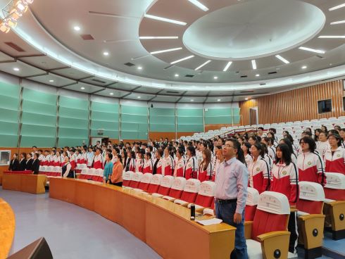 会议由副经理田纯广主持,他首先介绍参会领导及人员,随后全体人员起立,共唱中华人民共和国国歌,在庄严肃穆的国歌声中拉开了2023级新生开学典礼的帷幕。