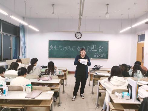 会议伊始,班主任提到,近期电信网络诈骗频发,通过讲述案例,强调了天上不会掉馅饼,莫占蝇头小利,更不要相信中奖信息,购物要从正规平台购物,不要给陌生人直接转账。莫要从事非法行为,远离非法APP,谨防被骗,从事违法行为还会受到法律的惩罚。随后,班主任向同学们介绍了违反《中华人民共和国反电信网络诈骗法》中有关法律责任的规定,如 个人从事组织、策划、实施、参与电信网络诈骗活动或为电信网络诈骗提供帮助,构成犯罪的,依法追究刑事责任。警示每位同学的莫从事非法行为,远离违法犯罪。接着班主任老师指出,即使遭遇电信网络诈骗后,也不要慌张。第一时间向辅导员汇报,尽快拨打110报警电话或就近向公安机关派出所报案。并及时准确地将诈骗分子账户信息提交给民警,申请账户紧急止付。最后,辅导员再次强调,针对电信网络诈骗每一位员工需做到“勤加防范,不受诱惑,及时举报”三要求,同时希望每一位员工 时刻绷紧防范之弦,严防电信网络诈骗。