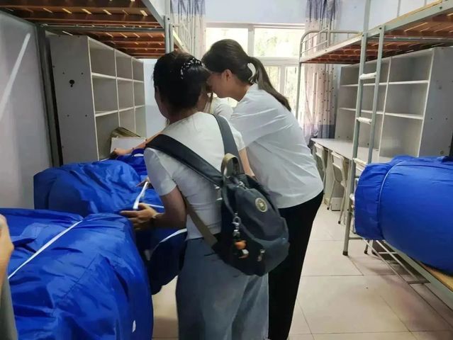 宿舍楼下,由学院老师与宿管阿姨组成的宿舍确认组协调安排新生住宿确认,为大家分发《新生住宿通知单》,为新生暖心服务,共享家的温暖。