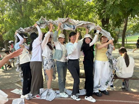 团建开始前,负责人认真讲解本次活动目的、规则以及注意事项,鼓励同学们既要尽力而为,又要量力而行。本次活动以“车轮报纸”小游戏拉开序幕。每个班级分为3-4个小组,由报纸连接成的封闭式大圆环立起来后要容纳全部成员,同学们需要边走边滚动大圆环,最先全队通过终点的队伍赢得比赛。在轻松愉快的游戏中,同学们彼此间的距离被迅速拉近。